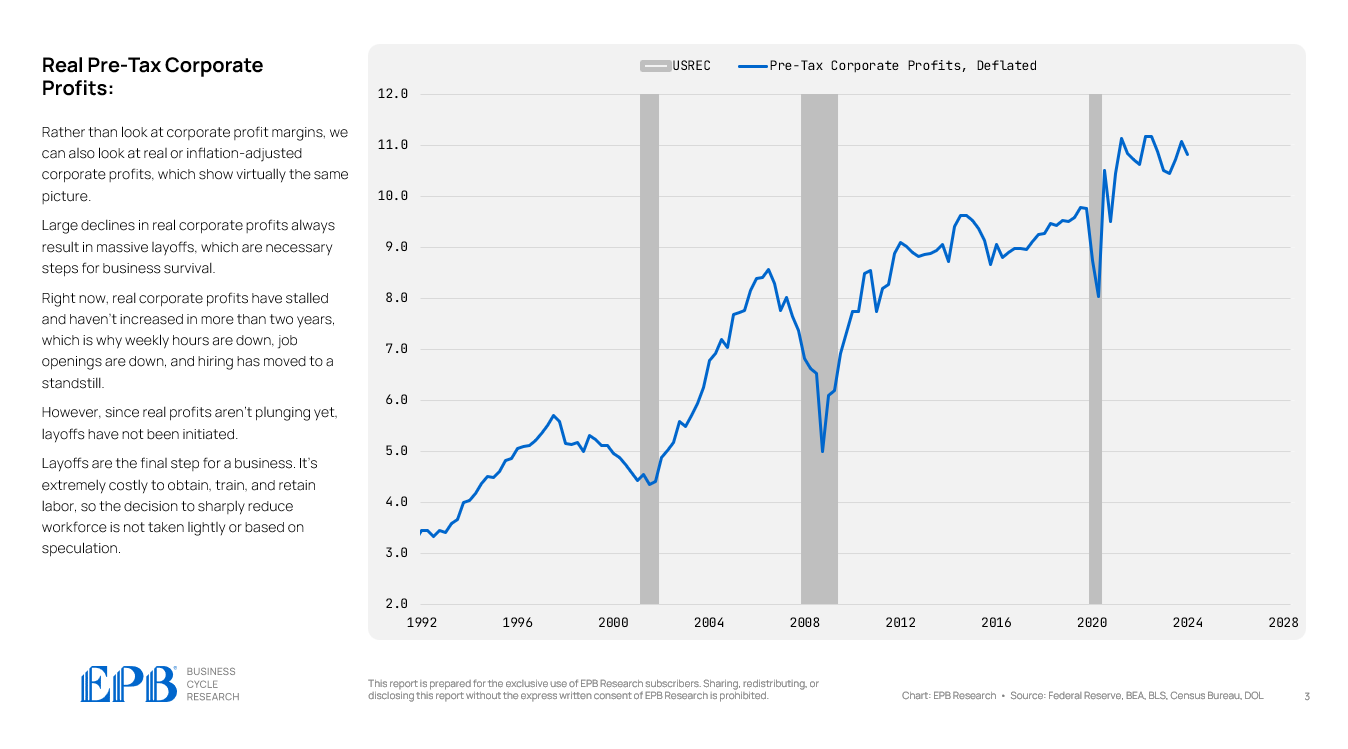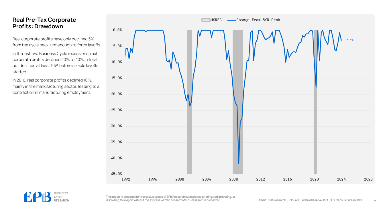 Real corporate profits have only declined 3% from the cycle peak, which is not enough to force layoffs.