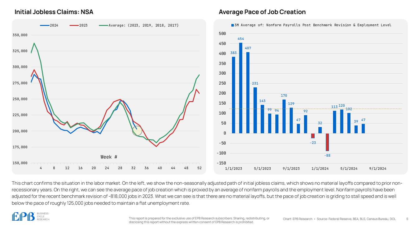 On the left, we show the non-seasonally adjusted path of initial jobless claims, which shows no material layoffs compared to prior non-recessionary years.