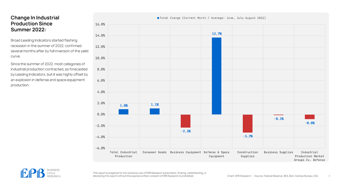 Since the summer of 2022, most categories of industrial production contracted, as forecasted by Leading Indicators, but it was highly offset by an explosion in defense and space equipment production.