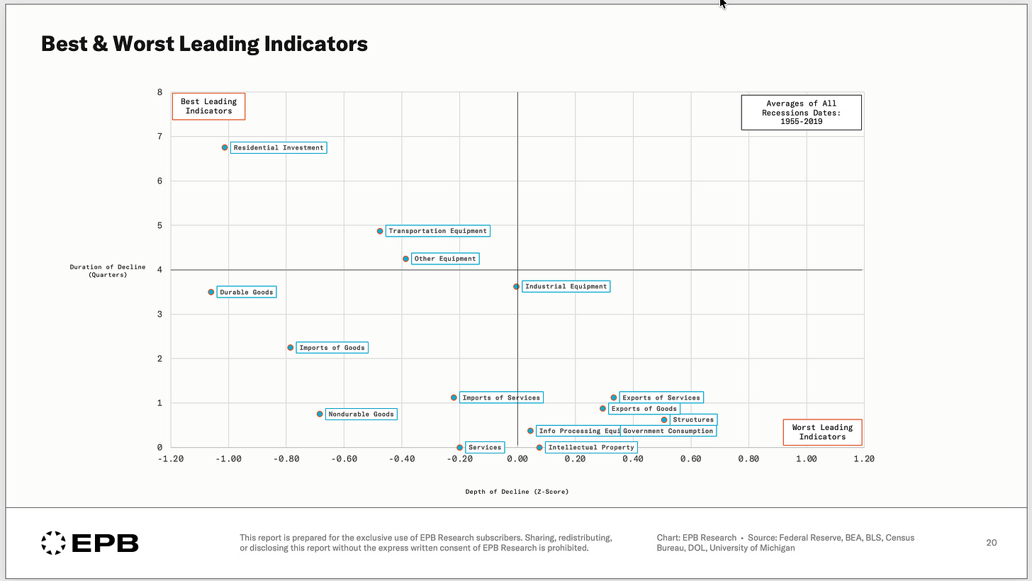 Residential investment: leads by roughly 7 quarters on average and also holds the deepest average contraction heading into recessionary periods. Housing investment is the clear standout as the best leading segment of the economy. It’s often said, “housing is the business cycle,” for this reason.