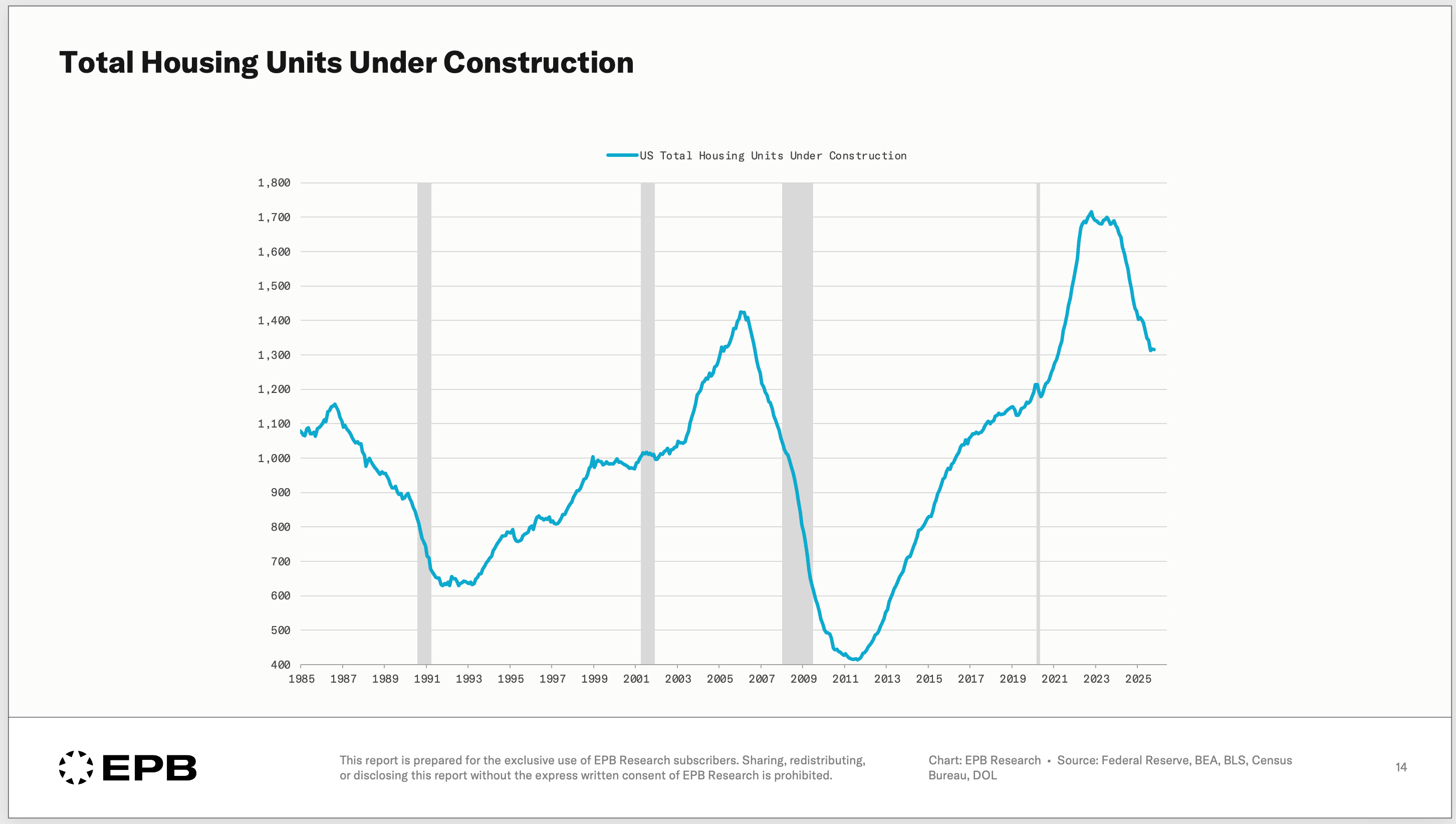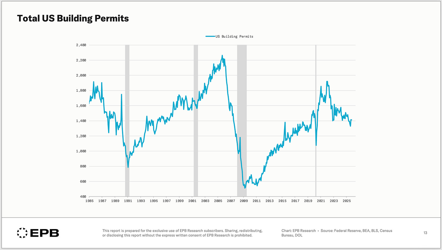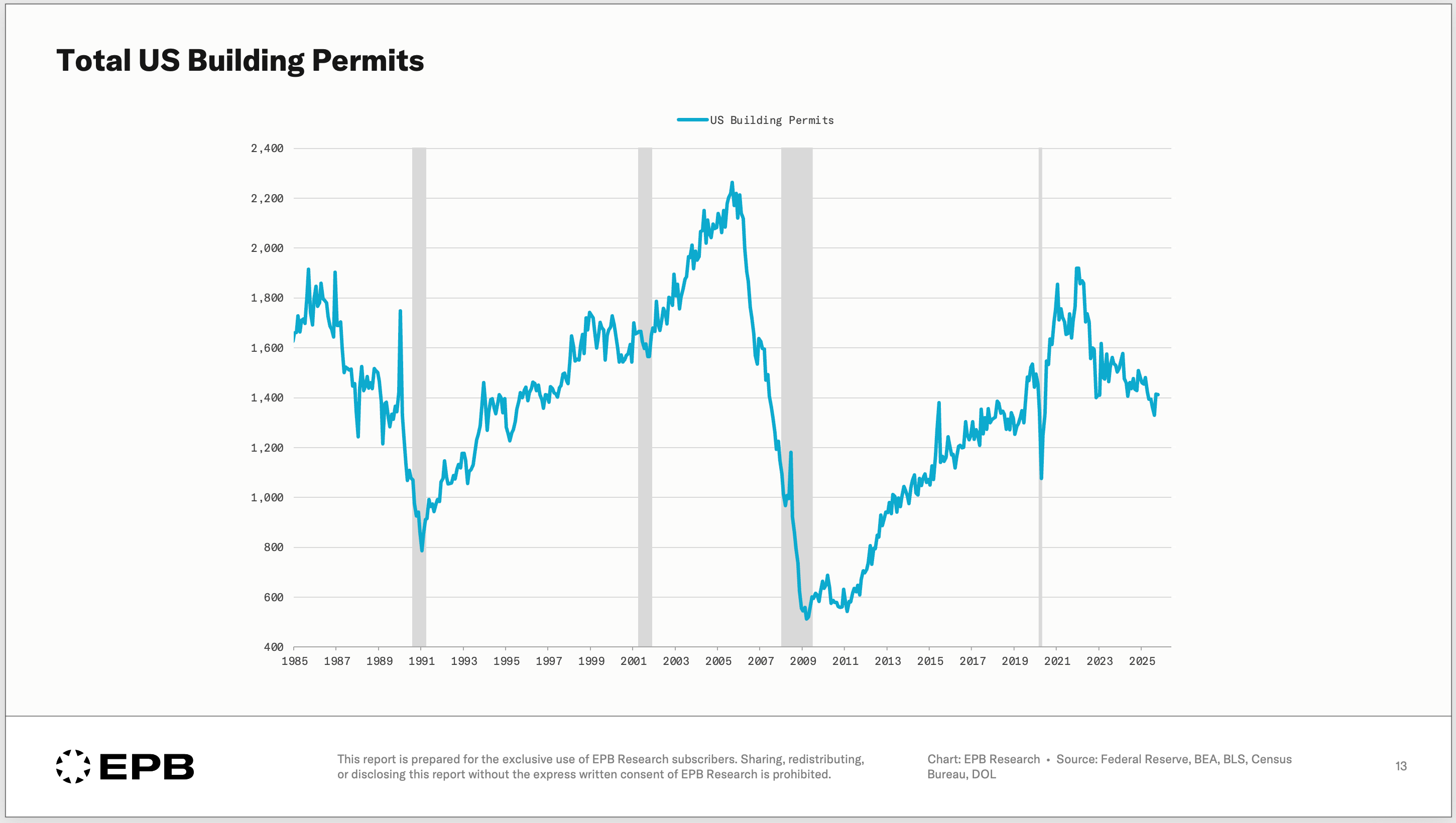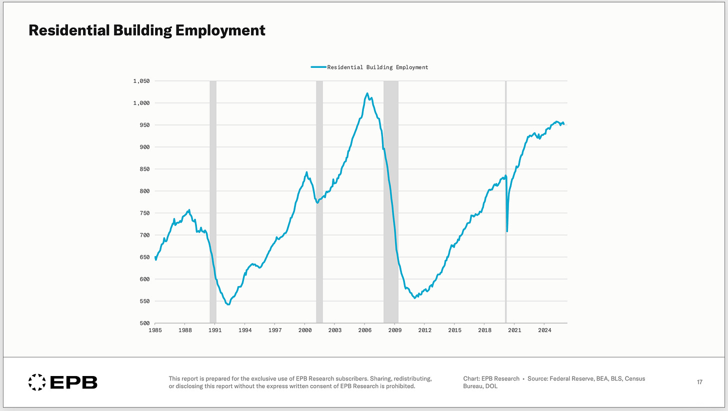 As of today, the transmission mechanism from building permits to residential employment remains incomplete. The front end worked as expected. Permits fell, and construction activity followed. But the back end, the employment and labor market consequences, never materialized at scale.