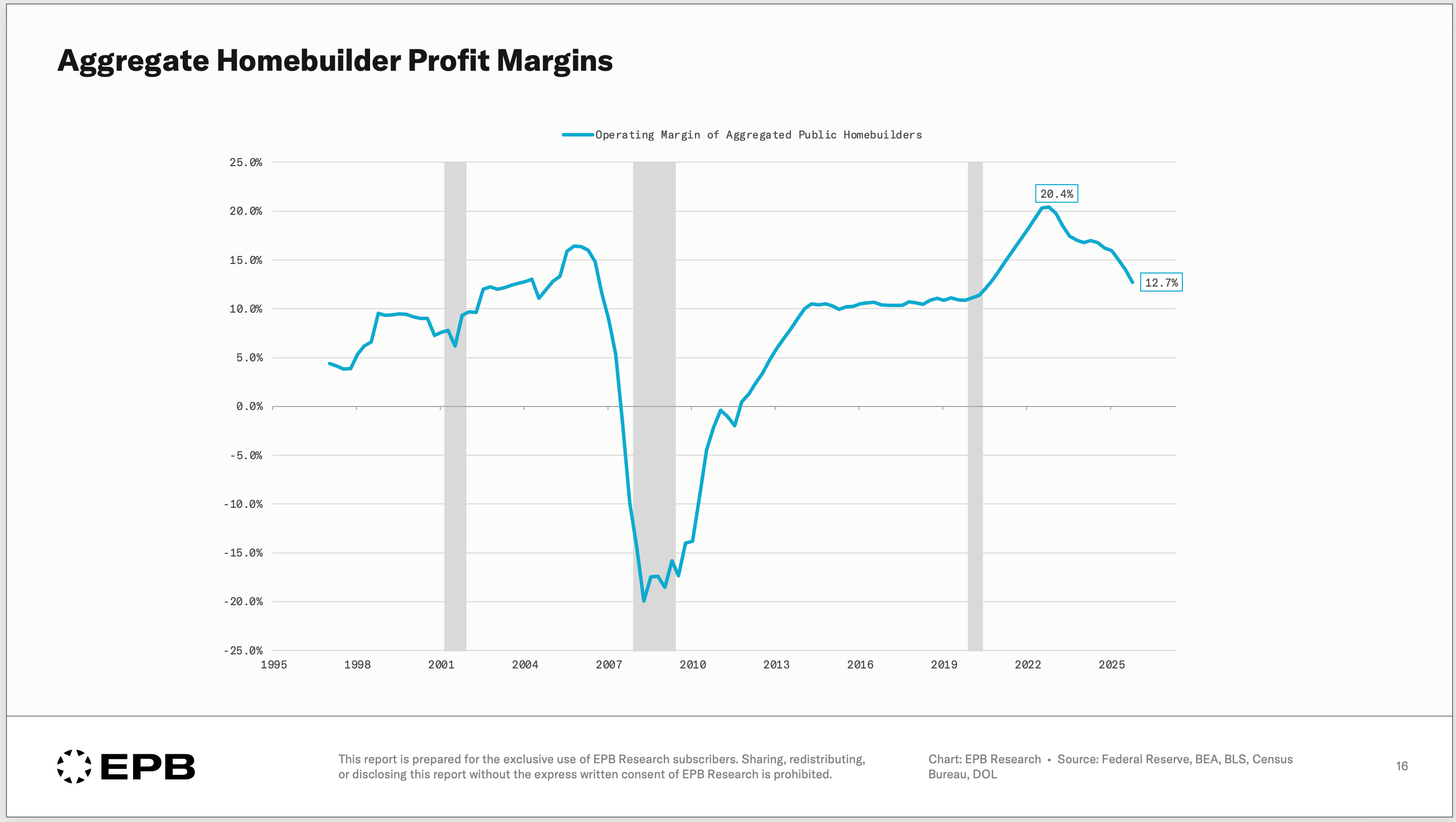 However, profit margins started from such an extreme level, above 20%, that three years of margin compression left builders with an average margin of 12%, still above where they operated for the entire decade pre-2020.