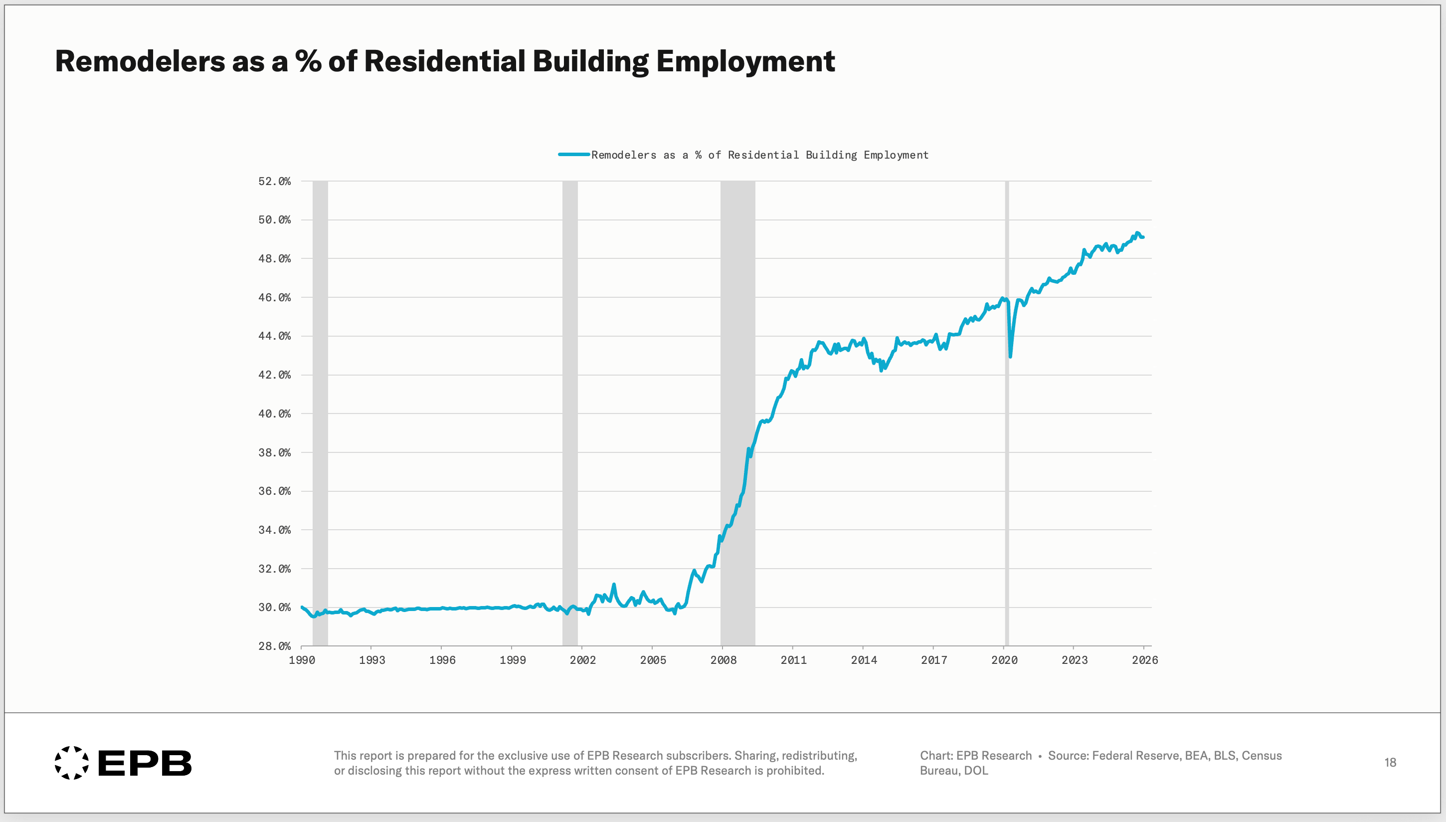 In the early 2000s, residential remodelers were only 30% of total residential building employment. Today, remodelers are nearly 50% of total employment.
