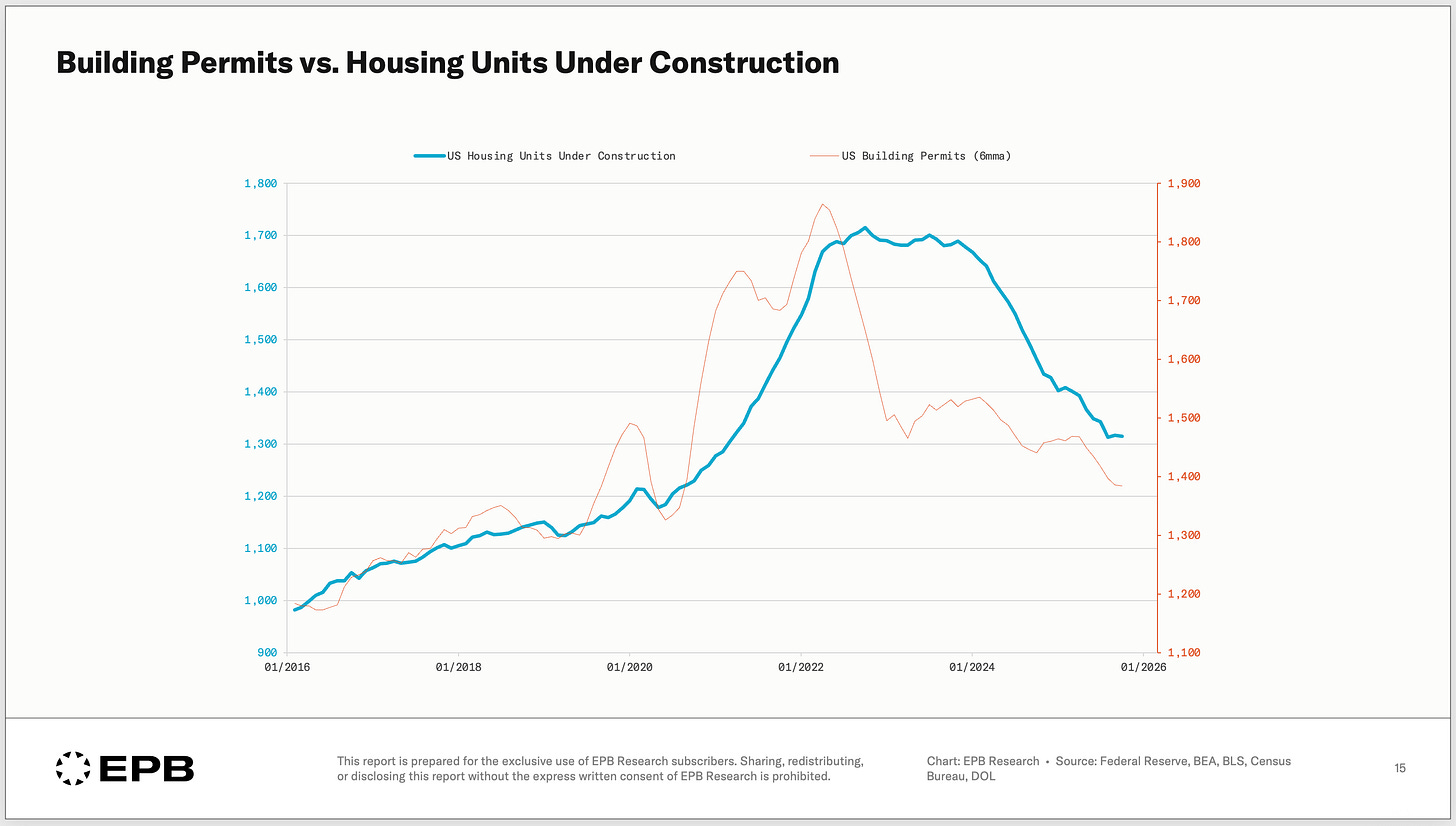 Building permits are issued before construction begins. Building permits signal what residential builders intend to do over the coming months. When building permits decline, fewer homes get started, which means fewer homes are under construction 6-12 months later.